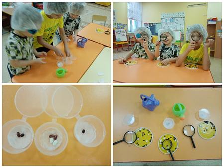В начале занятия дети узнали, что селекционер — это ученый-супергерой, который создает новые сорта растений. Ребята примерили белые шапочки и вооружились лупами для первых опытов. Наши юные ученые проводили лабораторные исследования. Они изучали разные виды семян через лупы, сравнивали их размер, цвет и форму. Ребята в теории изучили процесс прорастания семян и условия, необходимые растениям для их роста и развития. А затем провели практические опыты. Дети заложили эксперимент по проращиванию семян в прозрачных контейнерах, чтобы определить самые сильные зерна.