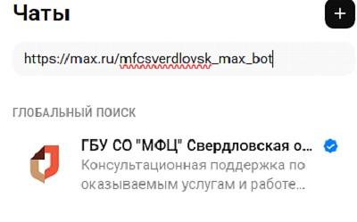 1. Необходимо зайти в приложение и в поисковой строке вставить ссылку на наш чат-бот (https://max.ru/mfcsverdlovsk_max_bot) или написать «ГБУ СО «МФЦ» Свердловской области».