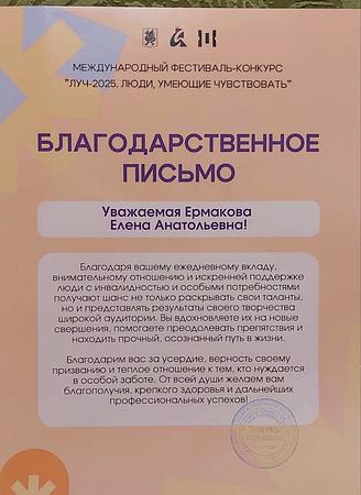 Благодарственным письмом была оценена работа наставника, руководителя инклюзивной творческой лаборатории «Театр слова» Елены Анатольевны Ермаковой. Это признание того, что работа с читателями является эффективной и дает большие творческие достижения и возможность самореализации людей с инвалидностью.