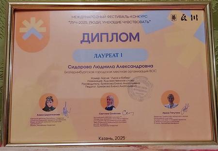 Достойное место среди талантов заняла читательница Свердловской областной специальной библиотеки для незрячих и слабовидящих им. Д.Н. Мамина-Сибиряка, участница инклюзивной творческой лаборатории «Театр слова» Сидорова Людмила Александровна. Она блестяще прошла серьезный конкурсный отбор заочного тура и получила право выступить в Казани. Людмила Сидорова покорила членов жюри своим артистизмом, обаянием и харизмой. Она выступала в номинации «Художественное слово», прочитав басню Сергея Михалкова «Лиса и бобер», и получила самую высокую награду – диплом лауреата I степени. Мы поздравляем Людмилу Александровну с заслуженной наградой и желаем дальнейших творческих успехов.