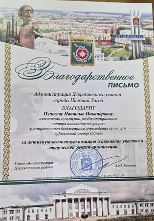 За активное участие в жизни Нижнетагильской местной организации ВОС и Культурно-реабилитационного центра инвалидов по зрению, за содействие в проведении социокультурной реабилитации инвалидов по зрению в связи с юбилеем Всероссийского общества слепых Наталья Никандровна Пунегова награждена медалью к 100-летию ВОС и благодарственным письмом Главы Администрации Дзержинского района Нижнего Тагила.