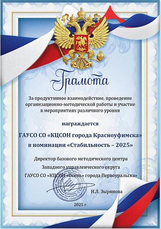 ГАУСО СО «КЦСОН города Красноуфимска» за продуктивное взаимодействие, проведение организационно-методической работы и участие, и победы в мероприятиях различного уровня Западного управленческого округа стало лучшим в номинации «Стабильность» и награждено грамотой.