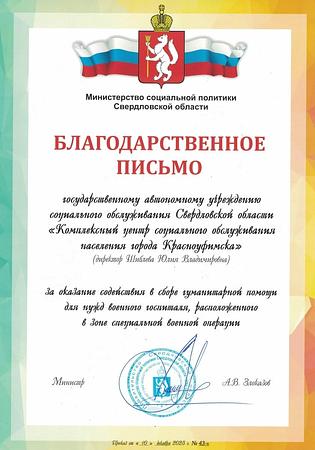 Благодарность от Министерства социальной политики Свердловской области