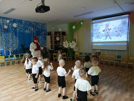 В преддверии праздника к детям на физкультурном занятии пришел снеговик. Он не просто ограничился простым появлением - организовал для ребят веселую игровую программу: дети из волшебного снега слепили снежки, учились метать их вдаль, а также играли в подвижные игры и танцевали. В подарок снеговик оставил им раскраски. Так у ребят появился новый зимний друг!