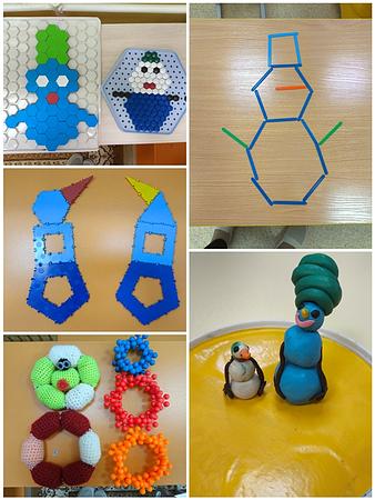 Объемное моделирование (Репейник, Молекулы): колючий конструктор «Репейник» позволил смастерить мохнатых, разноцветных снежных существ, которых так и хотелось потрогать. А из конструктора молекулы получились самые научные и ажурные снеговики.