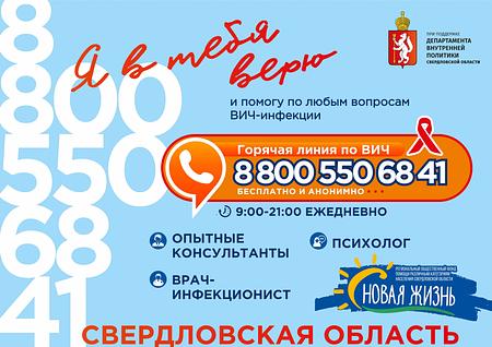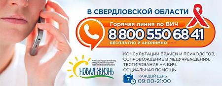 В рамках деятельности фонда «Новая Жизнь» реализуется проект «Горячая линия по ВИЧ», при поддержке Департамента внутренней политики Свердловской области, на которой работают опытные консультанты в области ВИЧ-инфекции, врач-инфекционист и психолог. По номеру 8 800 550 68 41 каждый желающий может получить бесплатно консультацию по любым вопросам ВИЧ-инфекции, сопровождение на тестирование и лечение, а также перейти на очное сопровождение при помощи социального работника. Звонок на Горячую линию является бесплатным и анонимным, и доступен для любого абонента сотовых и городских операторов связи. Горячая линия работает ежедневно, в т. ч. в выходные и праздничные дни, тем самым у людей во всех административных округах Свердловской области появилась возможность получить качественную консультацию в любой день недели с 9.00 до 21.00.