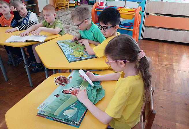 Также ребята услышали легенду из книги детского писателя Светланы Лавровой «Сказания земли Уральской» о том, как появились Уральские горы, далее познакомились с книгой «Сказки народов России» с «волшебным» карандашом, который позволяет самостоятельно прослушивать сказки и музыкальные файлы, что особенно важно для детей с нарушениями зрения. Читали вслух бурятские сказки «Дятел-труженик», «Снег и заяц» и нанайскую сказку «Айога».