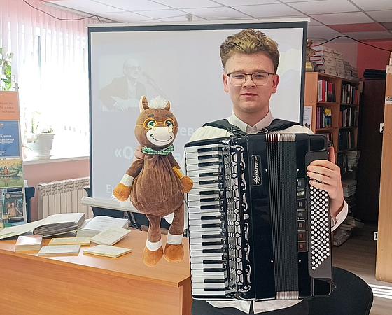 Особое волшебство вечеру придал молодой и талантливый исполнитель Вадим Столяров, ученик Детской музыкальной школы № 6. Его виртуозная игра на аккордеоне стала идеальным дополнением поэтической встречи. Вадим исполнил пронзительную и всеми любимую песню «Нам нужна одна победа» на стихи Булата Окуджавы. Эта композиция, наполненная силой духа и несокрушимой верой, вызвала особый отклик в сердцах присутствующих, напомнив о ценности мира и мирного неба над головой. Музыкальное сопровождение не просто украсило акцию, оно создало единое смысловое пространство, позволяя каждому почувствовать всю глубину и многогранность таланта поэта.
